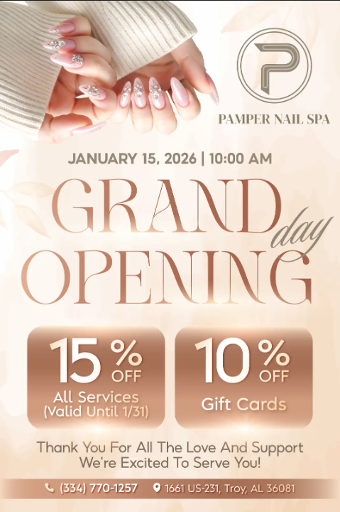 Pamper Nail Spa is a premier salon in Troy, AL 36081, specializing in professional nail care and relaxing spa treatments. Our skilled team delivers modern techniques and beautiful, custom results in a clean, stylish environment.